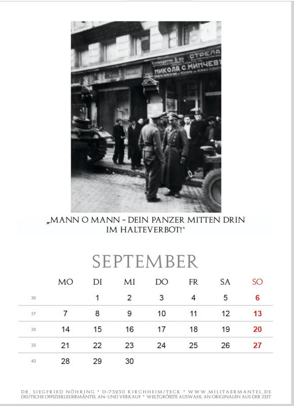 Beschreibung: Abmessung 15 × 21,5 cm auf Kunstdruckpapier (250g/m²) mit weißer Spiralheftung und durchsichtigem Deckblatt. Fotoillustriertes Titelblatt und 12 Seiten, jede Seite mit Monatskalender und einem Schwarz-Weiß-Foto, darstellend jeweils einen oder mehrere Offiziere der Deutschen Wehrmacht / Luftwaffe / Waffen-SS